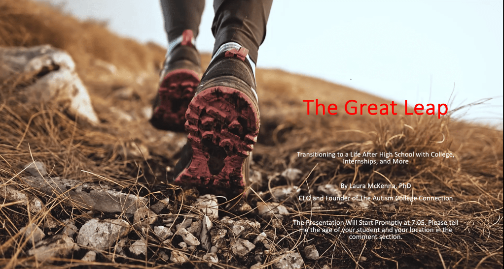 We gave our first webinar last week. Laura McKenna, CEO and Founder of The Autism College Connection, gave an overview of the options for students with autism and discussed her own journey to knowledge.