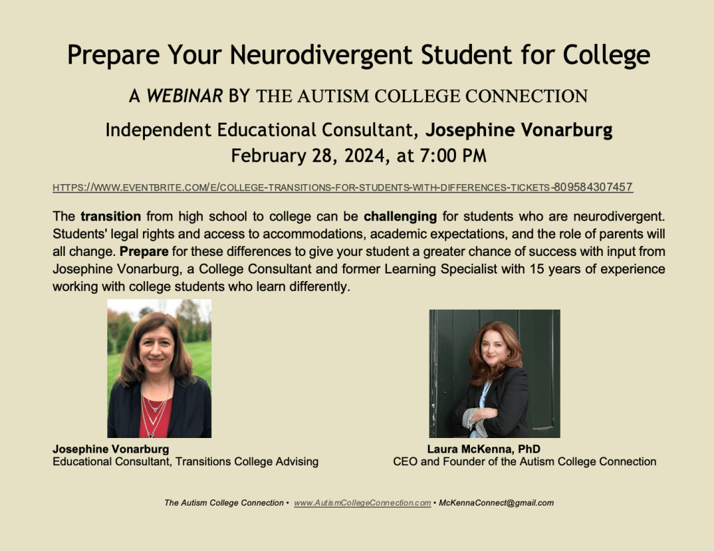 Sign up for: February 28th, 7pm — Josephine Vonarburg, consultant, “Prepare Your Neurodivergent Student for College”