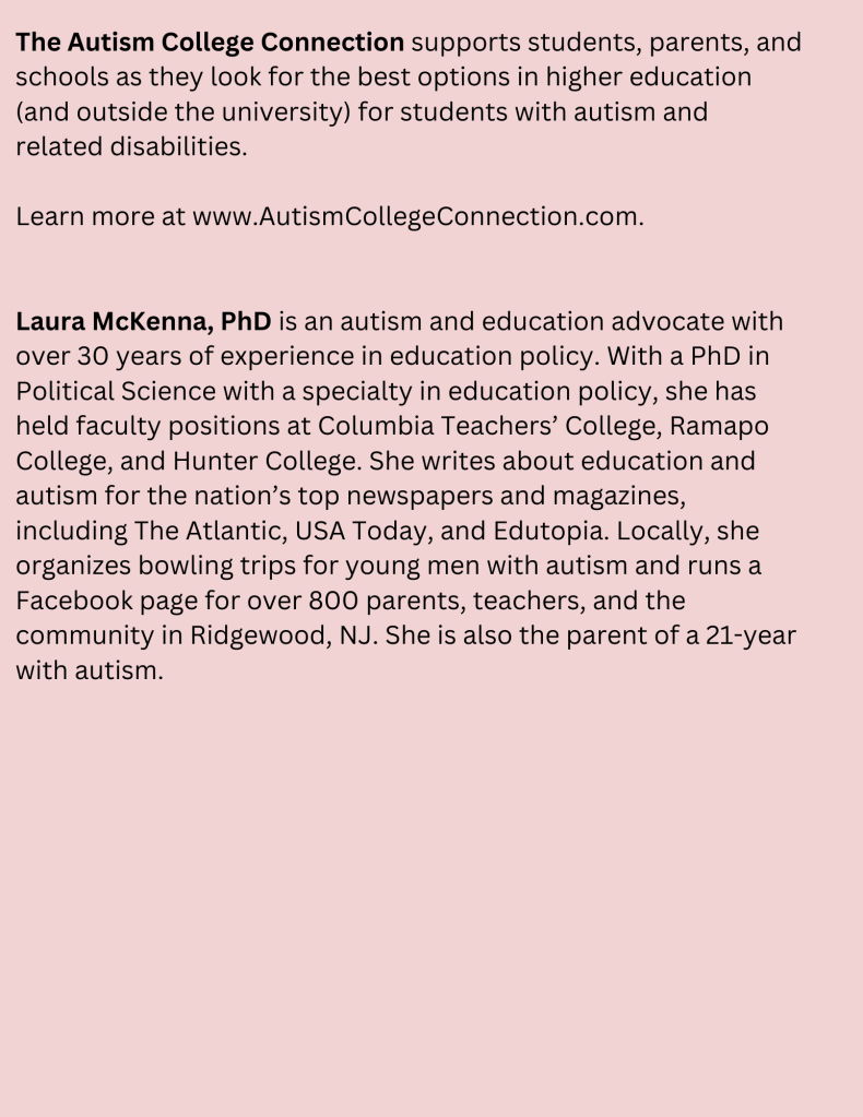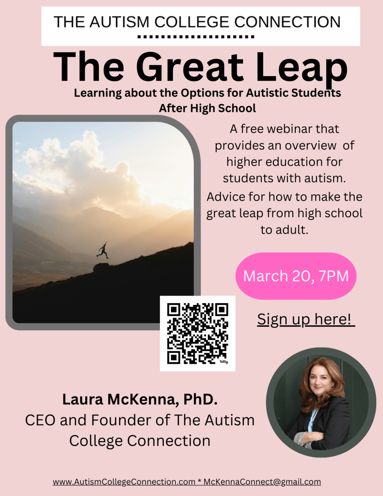 March 20th 7pm – Laura McKenna, Phd, CEO of The Autism College Connection, “The Great Leap: Learning about Life after High School”