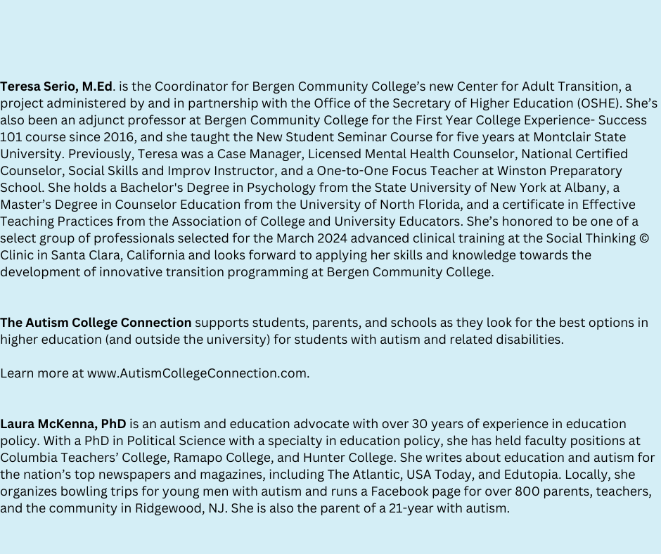 March 27th 7pm – Teresa Serio, Bergen Community College, “An Overview of The Program and Paths for Students with Disabilities at Bergen Community College”