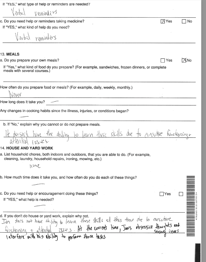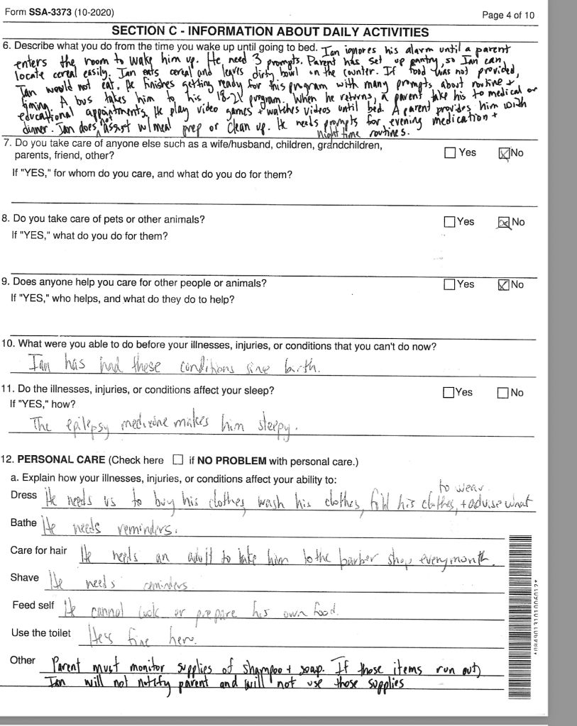 A question on the SSI application might be: “Can you eat breakfast on your own? Yes/No” (You will fill it out for your child.) You might think, “Yes, my son makes himself a bowl of Cheerios every morning.” You might want to check the “yes” box. However, you should first ask yourself a series of questions: Who buys the cereal? Do you set up the cereal on the same shelf every day? Who puts the bowl in the dishwasher? Who buys the milk? Is the milk in the same place in the fridge? Do you buy a particular brand of cereal every week? What happens if there isn’t any cereal on the shelf? Would he not eat that day?