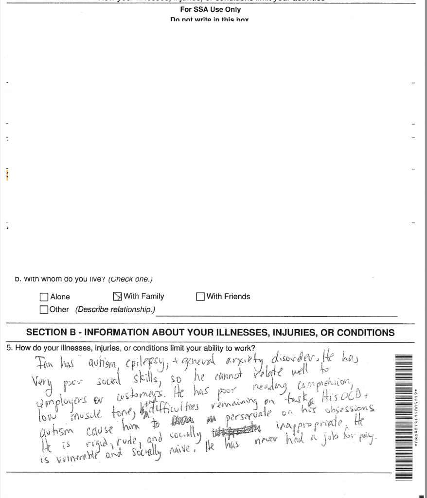There will be some questions that your student can’t answer because of language difficulties or because they’re uncomfortable with questions. You’ll have to speak up then. Unfortunately, you’ll have to speak negatively about your child in front of them. You might have to describe disturbing mental health issues and rehash some painful experiences. It will feel very mean to talk this way in front of your beloved child, but it is necessary. This evaluator must understand the full extent of your student’s disabilities before giving their approval for SSI.